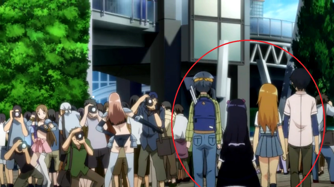 - In a flashback, at the Summer Comiket festival, people cosplaying as the four main characters of the light novel series Oreimo can be seen.